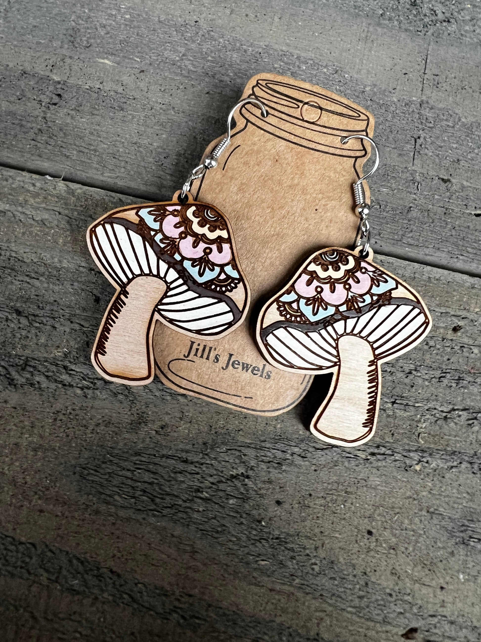 Boho Pastel Mushroom Hand Painted Wood Cutout Earrings
