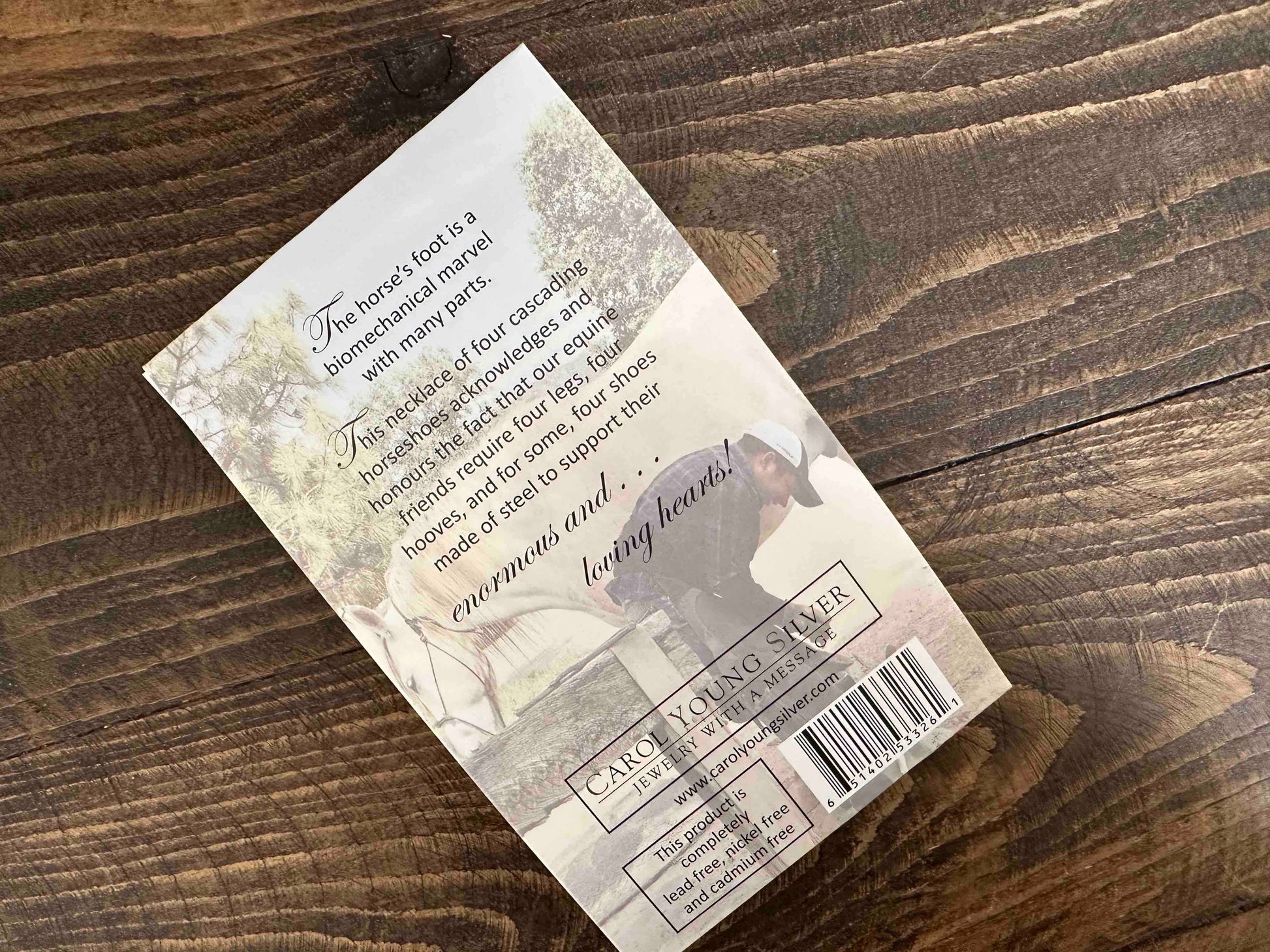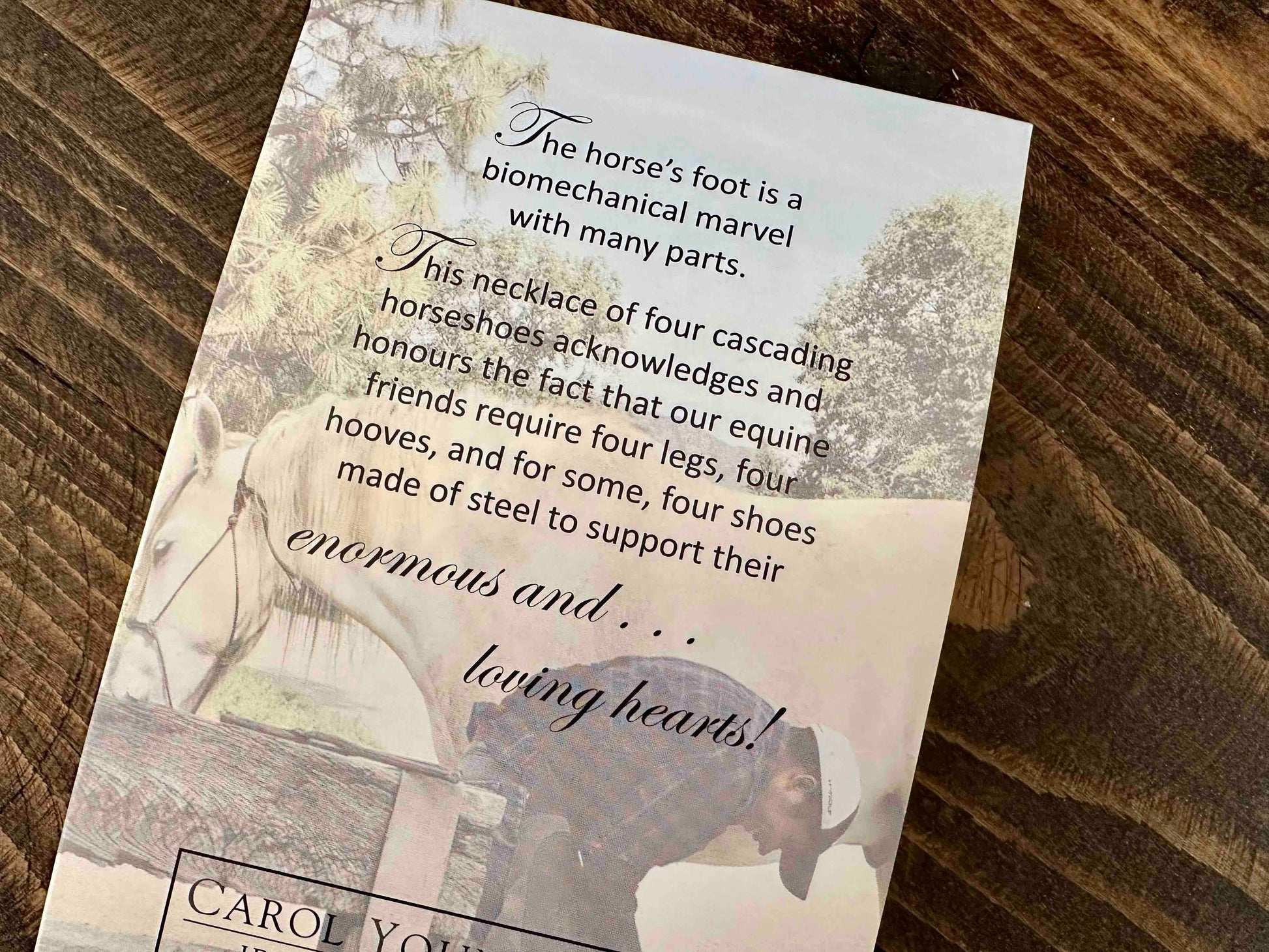 This necklace is packaged in a sweet card, sharing a message on the back about the loving hearts our equine friends have.