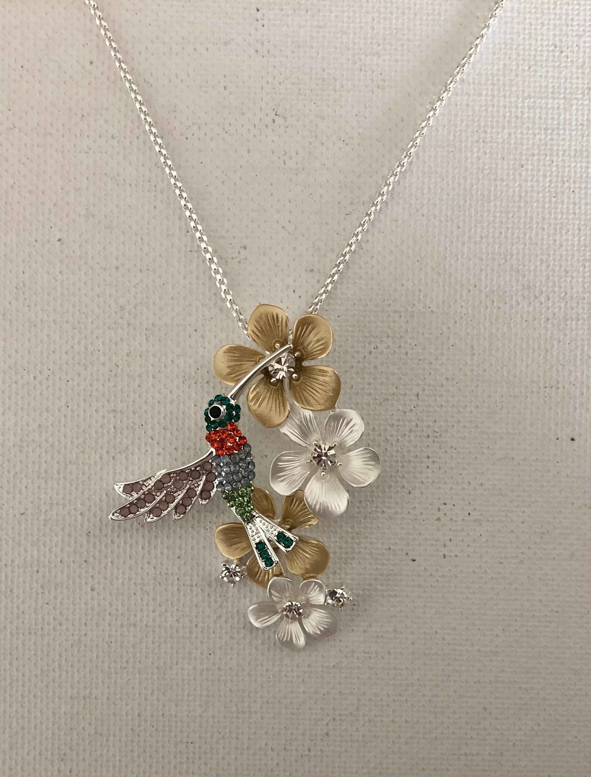 It's blingy and flashy, yet elegant and classy. A bunch of flowers, being visited by a sparkly, colorful hummingbird. My pictures do not do this piece justice, it's simply spectacular. The box chain adjusts in length from 16" to 20".