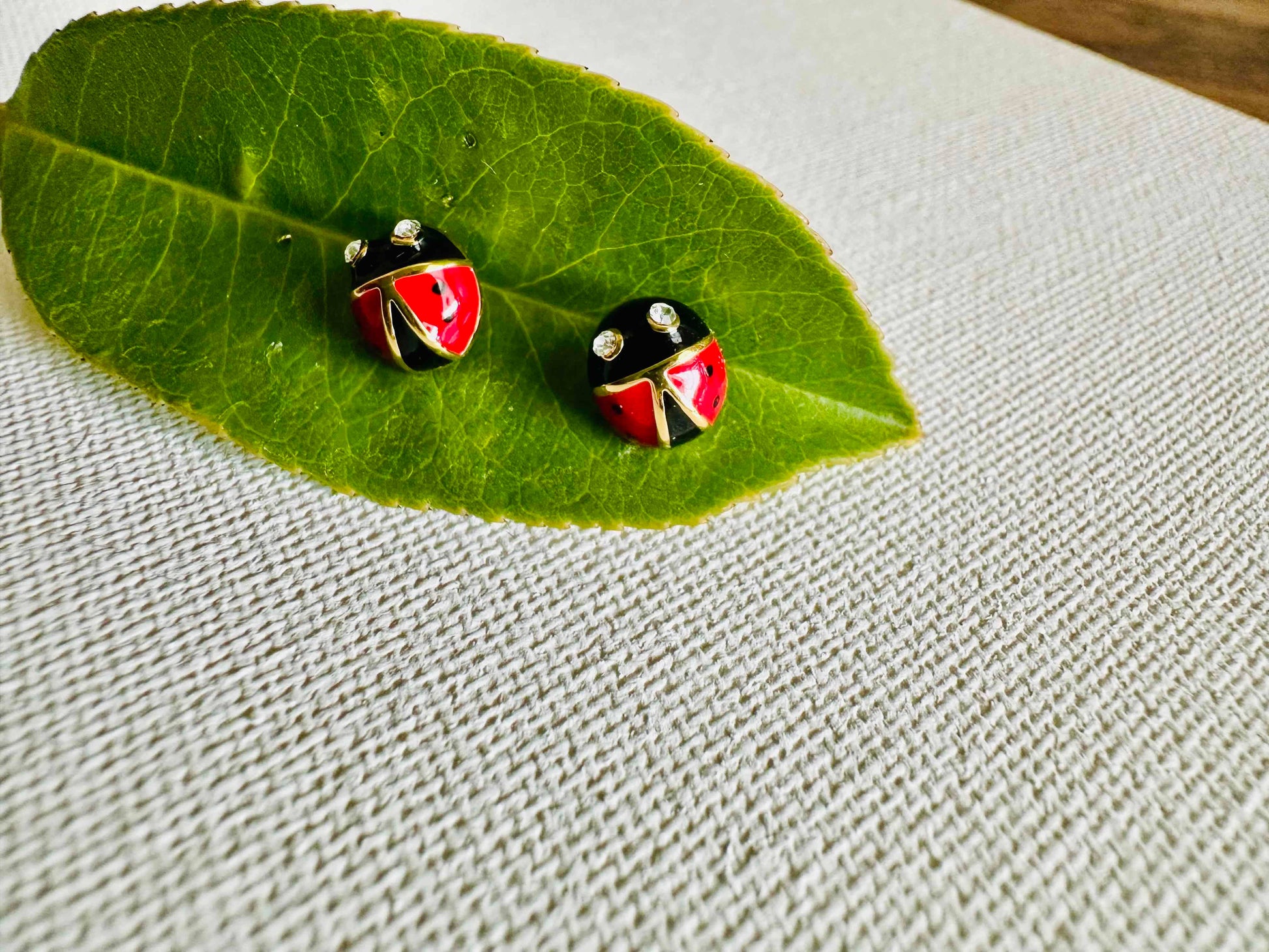 Awwww, look at this cute little Ladybug on a post. Darling red/black enamel, accented with white cubic zirconia's eyes and gold tone outlines. 100% HYPOALLERGENIC. Comes with a set of disk backings, as well as a spare set of rubber stoppers and packaged on an adorable card.