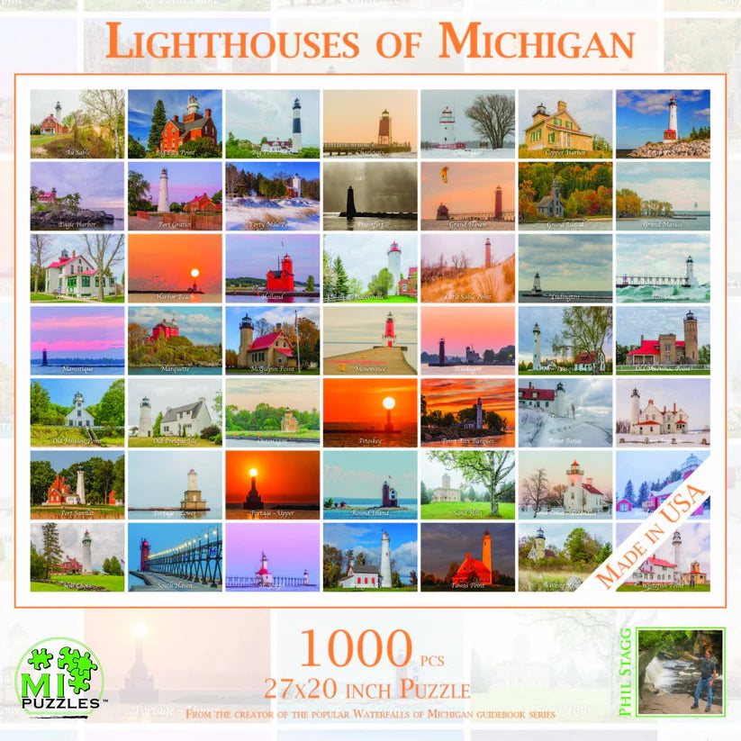 Lighthouses of Michigan, 1000 piece jigsaw puzzle, 27 x 20 inch Mi puzzles, Phil Stagg Photography, Puzzles of Lighthouses, Made in the USA, Local Artist.