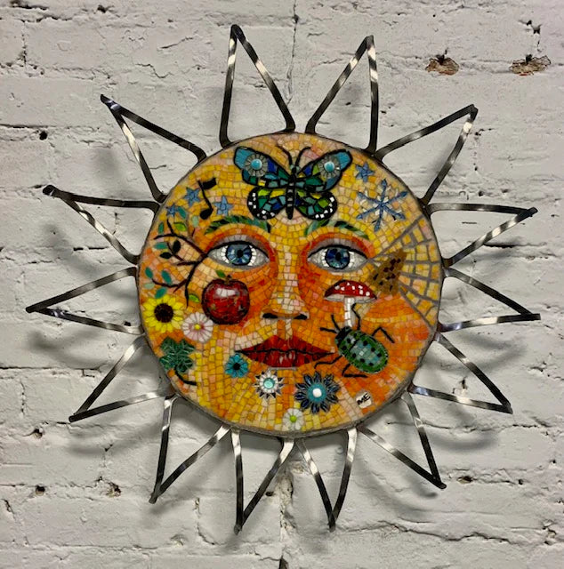 This Mosaic Sun by ME Mosaics, shines bright rays made from stainless steel remnants. The sun is made from hand cut glass. This can be hung outdoors in a covered area. The grout is a translucent epoxy that reflects the light from the glass.