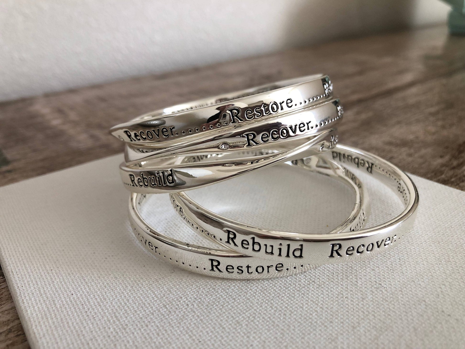 The words Recover, Restore and Rebuild are repeated inside and outside this unique mobius strip bangle. A single, classic white Cubic Zirconia adds an elegant and rich touch.