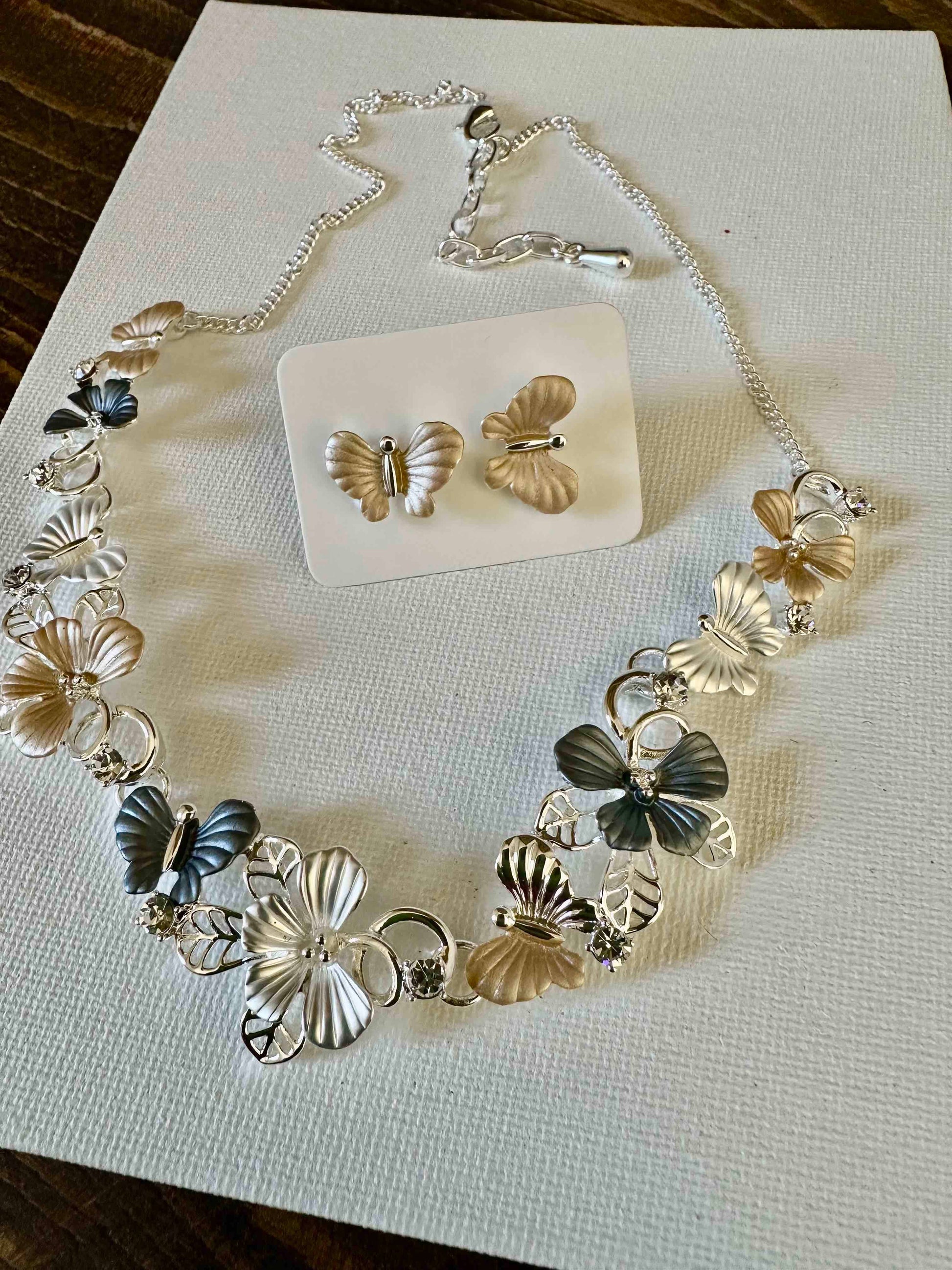 The necklace is simply exquisite, featuring butterflies of silver, gold and pewter tones, sprinkled with sparkling, white stones.