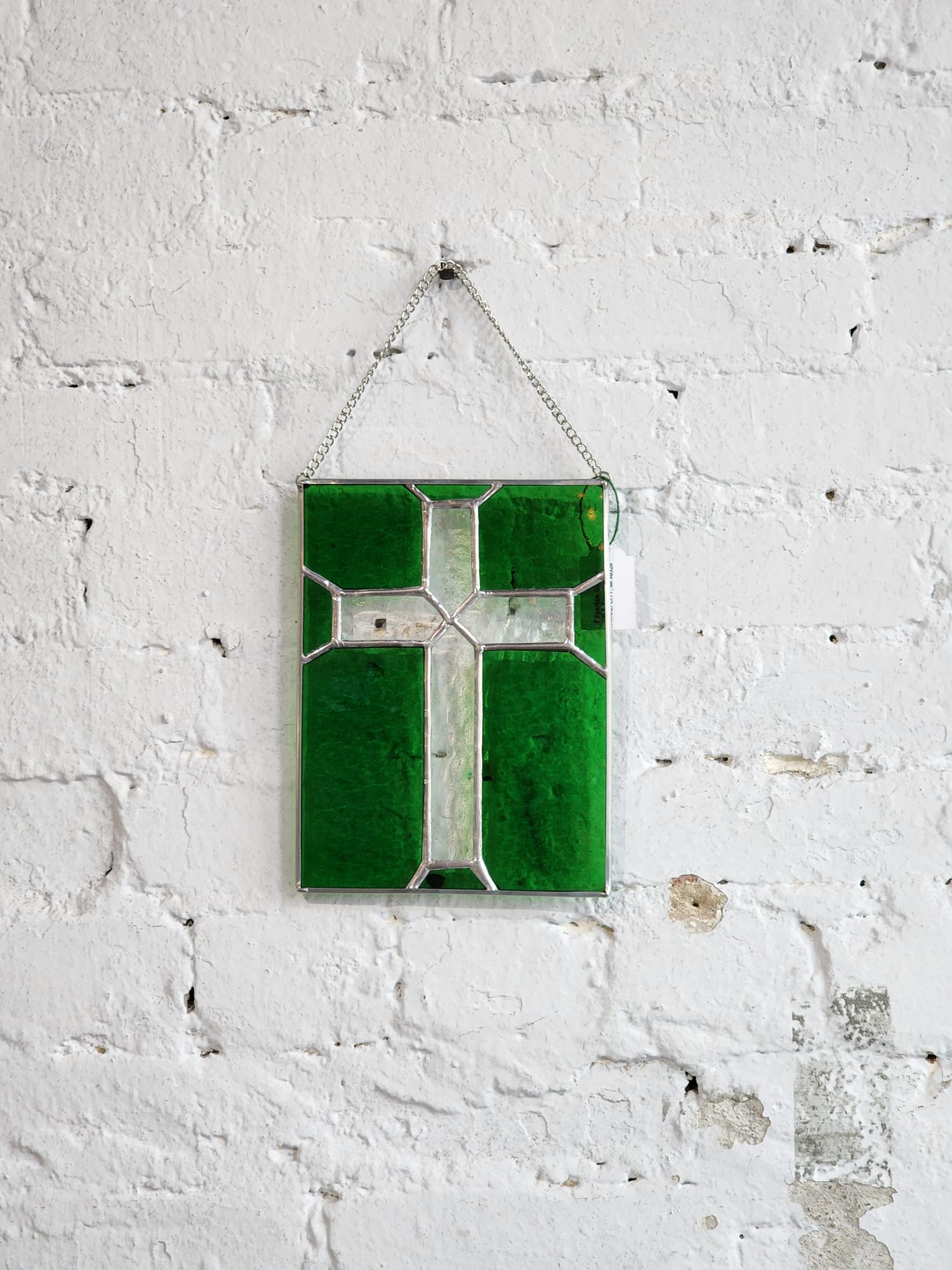 Stained Glass cross. Each piece is handmade and has its unique look. Attached Chain to hang.